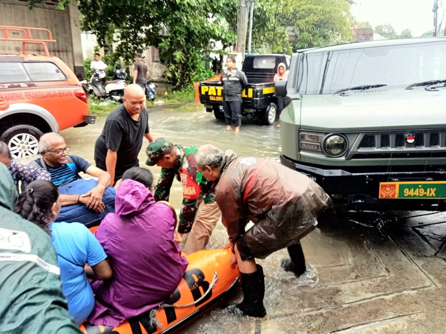 Dengan sigap dan penuh siaga, Danramil 1611-03/Kuta, Mayor Inf Hendra Gunawan, bersama Babinsa segera mengevakuasi warga dan tamu yang terdampak. Evakuasi dilakukan menggunakan 3 (tiga) perahu karet yang didukung oleh Badan Penanggulangan Bencana Daerah (BPBD) Provinsi Bali, memastikan semua yang terjebak dapat dipindahkan ke tempat yang aman.